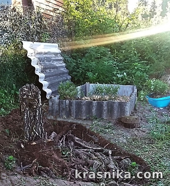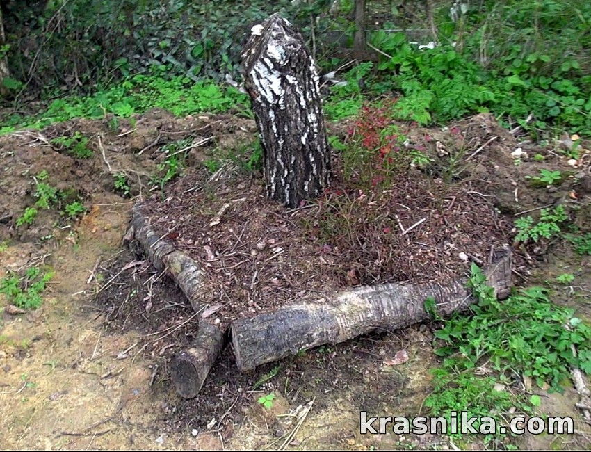Для этого вокруг березового пня, между корнями был снят слой земли глубиной в штык лопаты, и уложены куски корней оставшиеся от выкорчевывания другого березового пня.