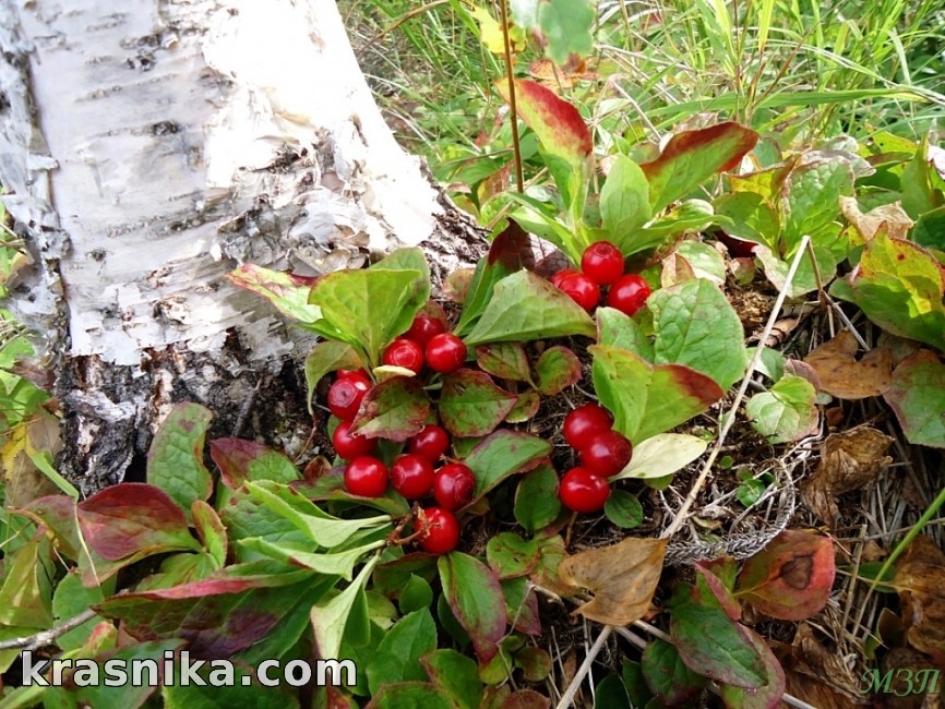 “Красника - низкорослый (8-10 см) почвопокровный ягодный кустарничек из семейства Брусничные. Красника удивительно красива. Ее крупные, как у березы, листья несколько раз за сезон меняют окраску. В мае они нежные салатно-зеленые, позже становятся темно-зелеными с эффектным багровым обрамлением. В июне, когда растения зацветают, листва, как бы вбирая в себя солнечные лучи самых длинных дней в году, приобретает однородную темно-зеленую окраску. На этом фоне хорошо смотрятся бело-розовые цветки, собранные в небольшие (по два-три цветка) кисти. В конце июля-начале августа под зелеными зонтиками листьев обнаруживаются розовые ягоды. А когда в конце августа ягоды полностью созревают и приобретают алую окраску, листва становится малиново-красной. Кругом все еще зеленое, и осенний наряд красники выглядит в это время особенно привлекательно.” (Смирнов И. Ю. - Красника // Наука и жизнь №10, 1999 г.)